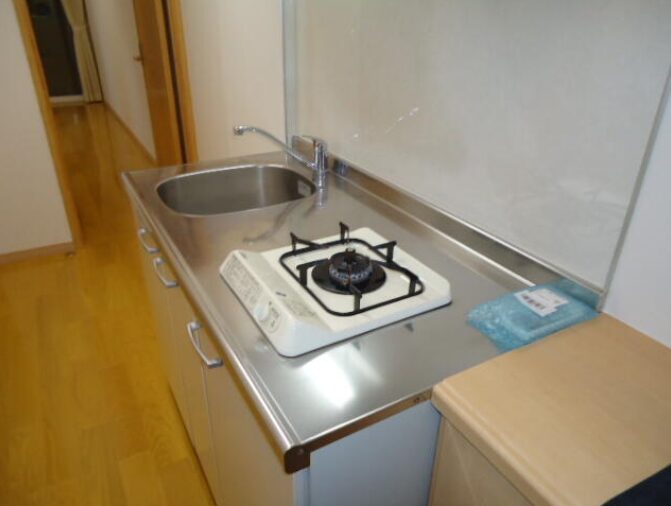 ガスコンロ1口付きのシステムキッチン。簡易的な調理スペースもあるので自炊をされたい方にもピッタリ。キッチン脇には冷蔵庫置き場+フリースペースもあります。毎日の調理が快適に。お一人暮らしでも料理を楽しめる設備です🍳